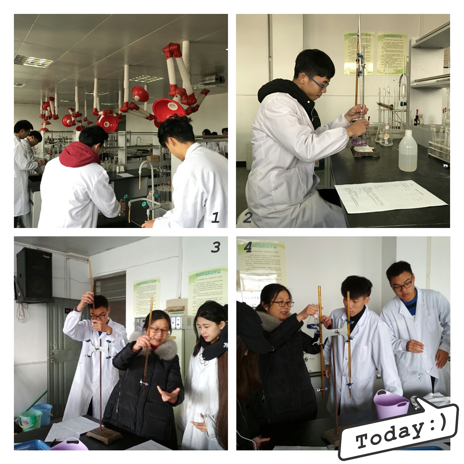 在环监专业比赛现场,各参赛选手心无旁骛,高度专心在操作机台上争分夺秒却又有条不紊。选手对试剂准确无误的吸取,移液,装入,滴定时规范操作,见滴成线,最后快到计量点时半滴操作(下图1,2);指导老师一丝不苛,对选手的每一个动作都核对确认,他们高度负责的精神也深深地激励着每个选手(下图3,4)。在这场比赛中,参赛选手都倍加努力,欲在这短短时间将自己的作品完成地更好。