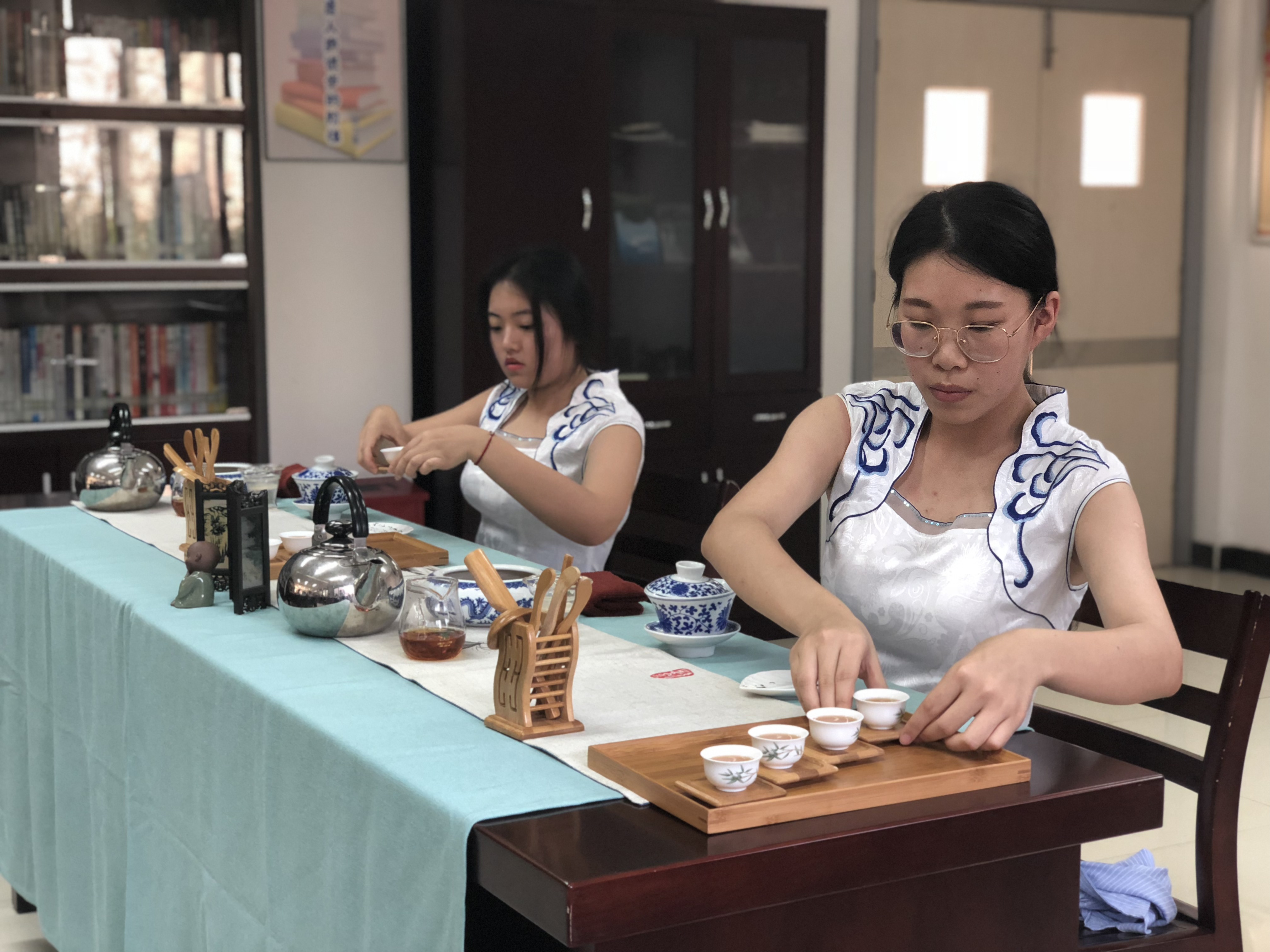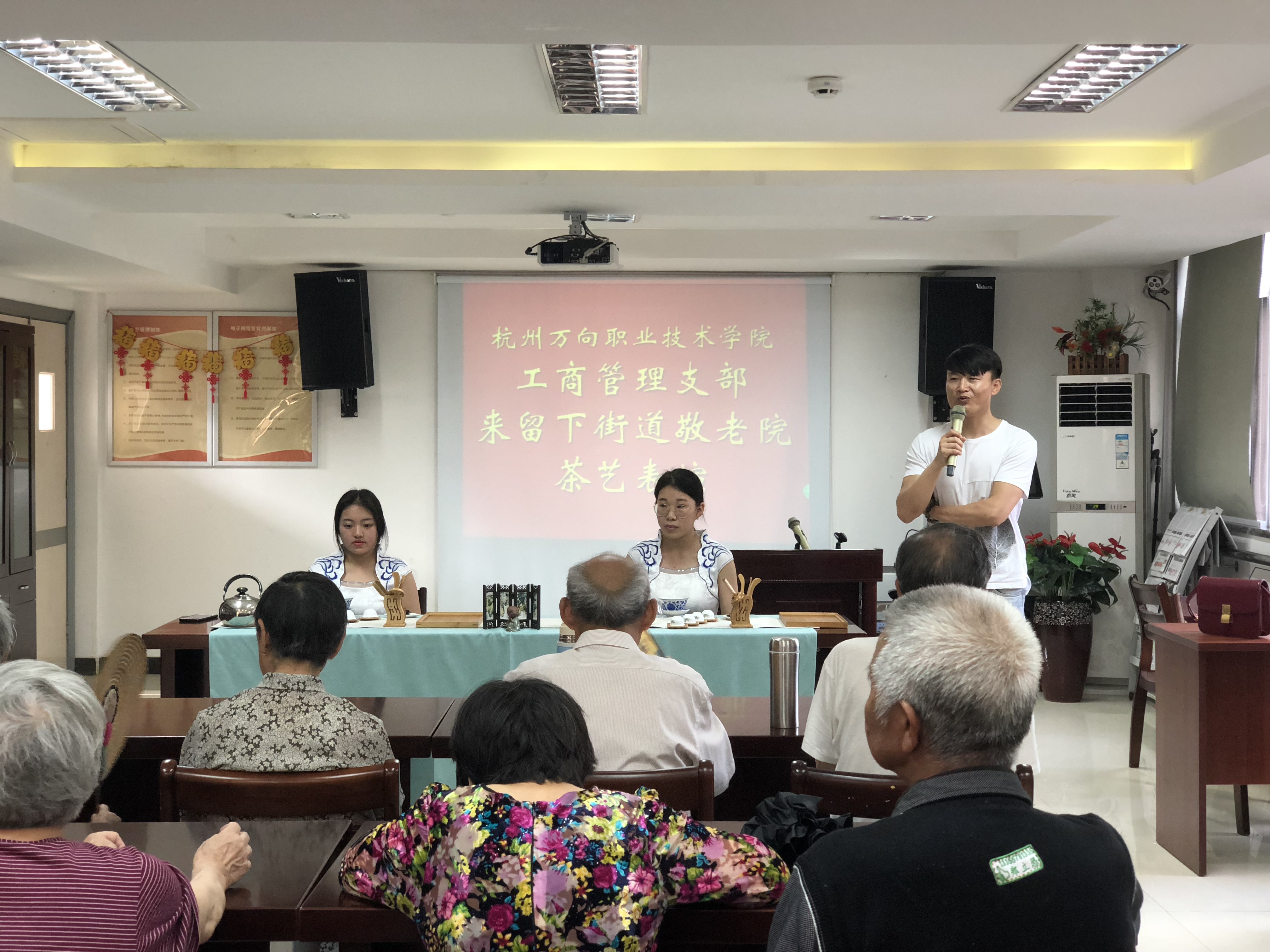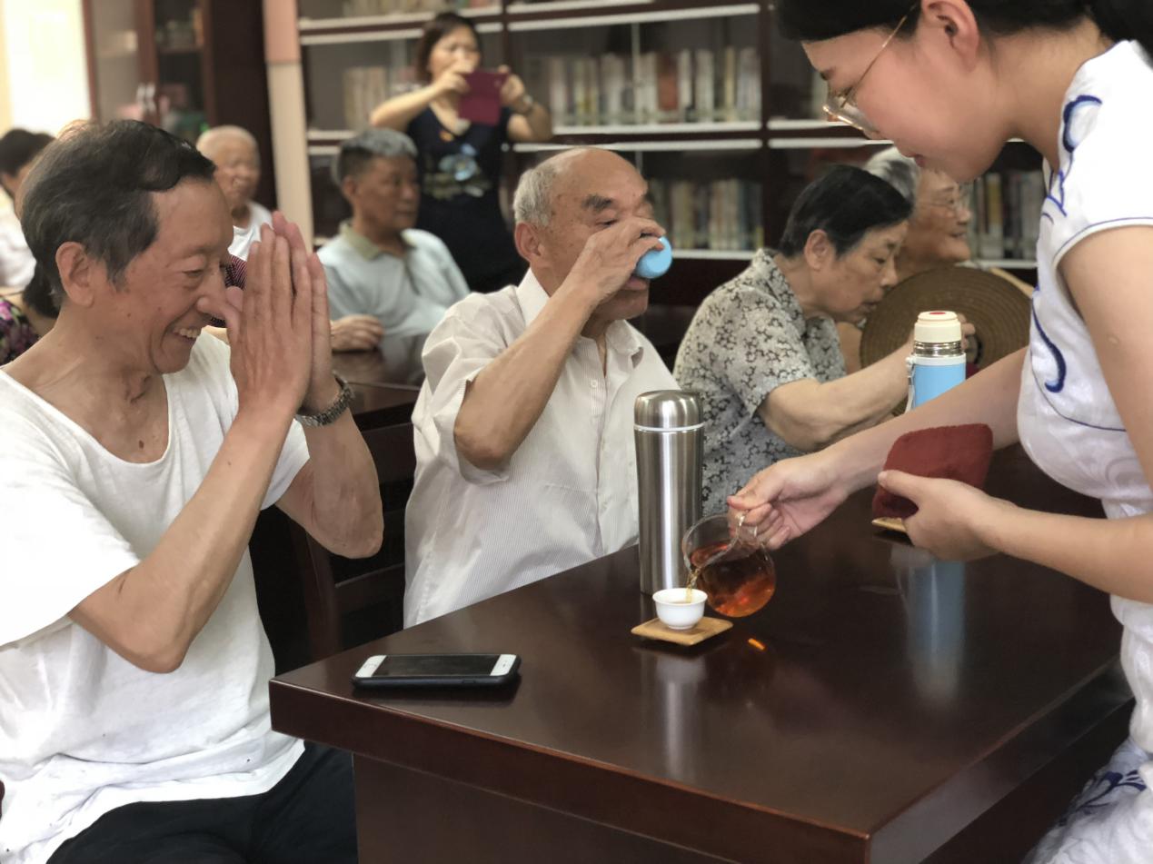“尊老敬老仁之本,和谐社会孝当先”,此次志愿活动在“茶艺表演中”拉开了帷幕,向老人们展示了中国传统的茶文化,老人们各个目不转睛,时不时拿起手机拍照,也表达了对中国传统文化的喜爱,当一杯杯温热的红茶敬到老人面前的时候,老人们无不露出欣慰的笑容,正所谓“茶香缕缕,传承美德”。其后,管理支部的同学们为即兴献唱了《外婆的澎湖湾》、《七子之歌》、《采茶舞曲》等,欢笑一堂,其乐融融,老人们也互有往来、参与其中,为大家表演了他们时代的经典歌曲,在茶香中、在歌声中,我们穿越了时代,一切显得那么的自然、和谐。