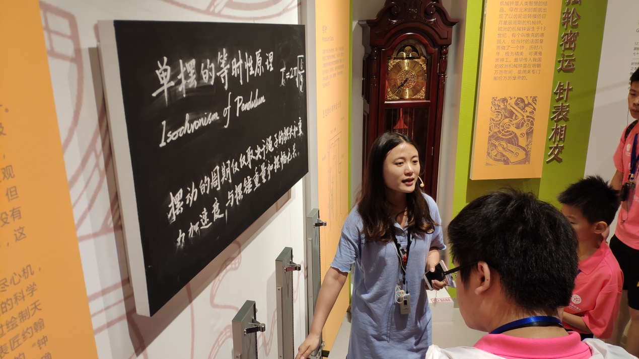 时间科学馆内讲解员为我们解释单摆的等时性原理及推导过程