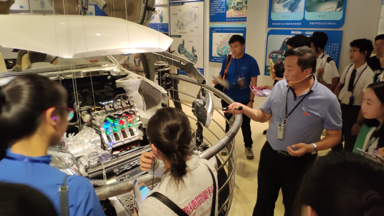 长安大学交通馆内老教授为考察团学生们讲解四冲程内燃机8字口决“进压爆排1342”