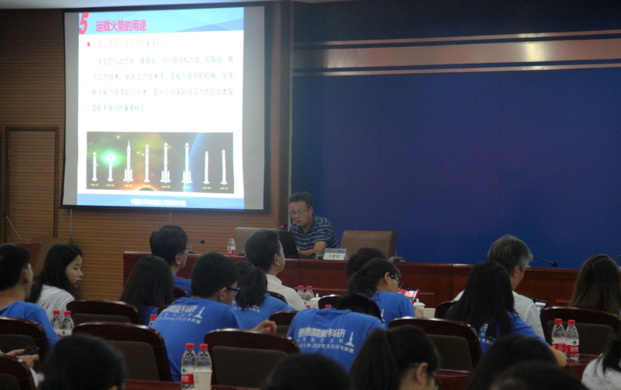 7月28号,航天科技考察团一行同学来到了位于灞上的航天动力技术研究院(中国航天科技集团公司第四研究院)。在航天四院,固体火箭发动机专家王健儒为我们讲解了新中国火箭技术的发展历程、世界火箭燃料技术的发展史、固体和液体火箭发动机各自的优缺点、航天四院对我国民用航天技术的贡献等等知识。他还特别为我们展示了我国最新研制的长征11号全固体动力运载火箭,它直径3米、150吨推力的新型固体发动机系我国目前推力最大也是最为先进的固体火箭发动机,它的三米两分段大型固体火箭助推发动机技术可使我国近地轨道运载能力达到100吨以上,满足我国载人登月、深空探索的发展需求。而王健儒研究员正是长征11号火箭发动机的总设计师。