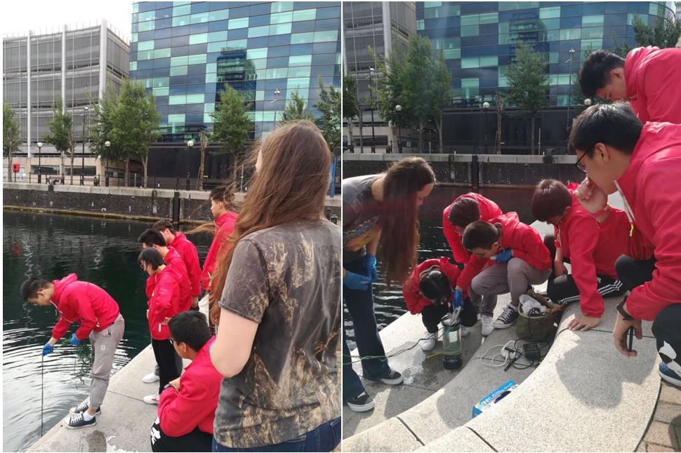 当地时间8月28日,蓝天白云倒映在曼城的运河河面上,晴空万里,是个采样的好日子。在黄展鹏学长的带领下我们与Natalie和Enya博士相约在了HURON BASIN河边,进行水样的采集和检测学习。先是由他们为我们介绍这条河的历史,之后为我们详细讲解了该如何去采水样,以及需要检测的内容,包括水的pH值、溶解氧含量、电导率等很多知识。两位博士做了许多专业的名词解释,比如说溶解氧含量低于所河流标准值时,水中的生物就会逐渐死亡,所以他们会来这里进行定期的水质采样与检测,能够很好地控制住这片河流的动态情况,维护河流的生态平衡。