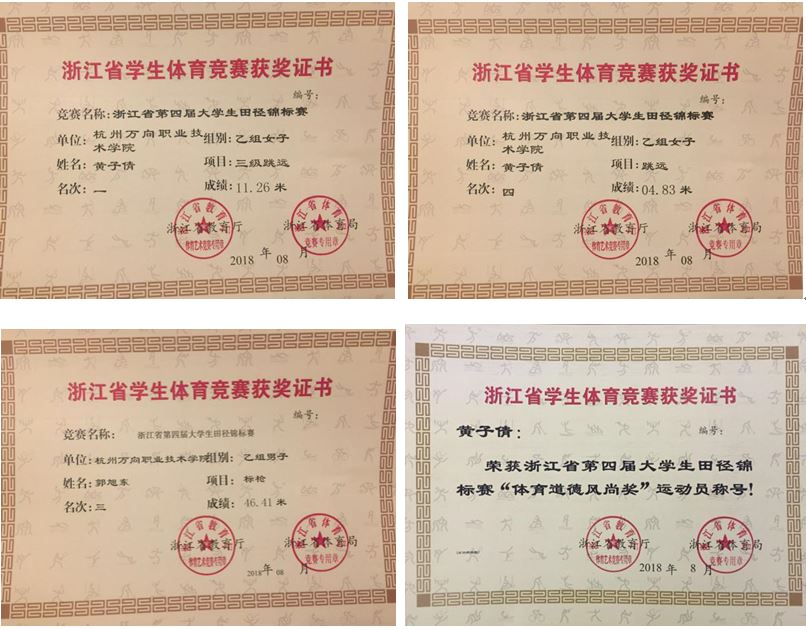 2018年8月,第四届浙江省大学生田径锦标赛在浙江大学紫金港校区落下帷幕,我院绿色食品生产与检验专业食品161班的黄子倩同学获得女子乙组三级跳远冠军、跳远第四名,并获体育道德风尚奖运动员称号,农产品流通与管理专业农管171班郭旭东同学获男子乙组标枪第三名的好成绩。