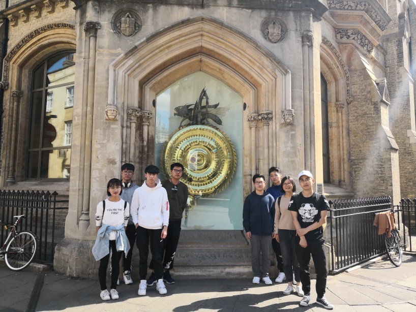 在经过剑桥市中心街口时,我们看到一个大型雕塑时钟。经导游解释,我们才知道这是剑桥标志性景点――圣体钟,2008年由霍金揭幕,通过一只蚱蜢吞吃时间提醒人们时光流逝。表盘犹如水滴落下泛起的涟漪,时针行走忽快忽慢,表示生命无常。我们在圣体钟前合影留念,提醒自己要珍惜时间。