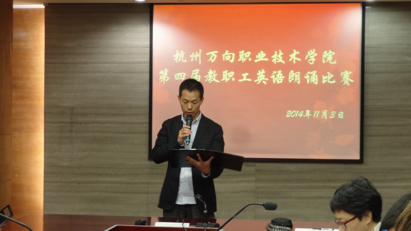 2014年11月3日晚,在学院新校区6213会议室举行了我院第四届教职工英语朗诵比赛。本次比赛由人力资源处主办,各部门选派的18位代表参加。比赛由人力资源处副处长傅军华主持,经济贸易系高兰、学生发展处徐佩兰、交流合作处丁浙涛、外教Bryce四位教师担任评委。
