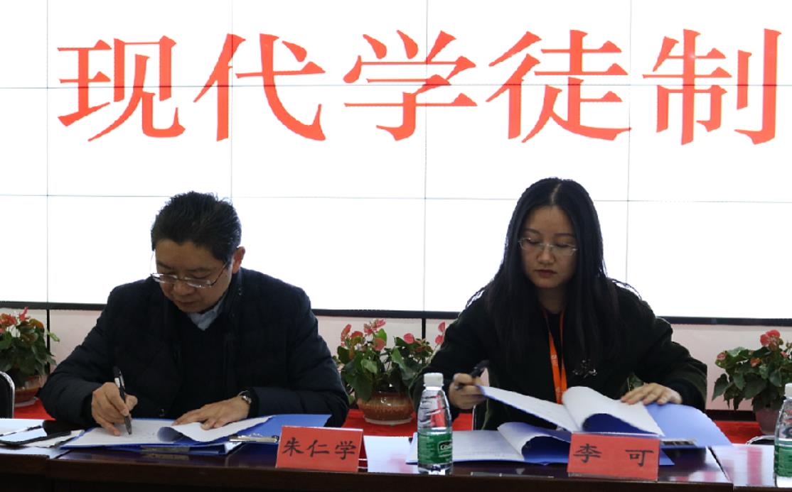 第六项议程,朱仁学副院长与李可经理在现场举行现代学徒制10年合作协议书签约仪式。