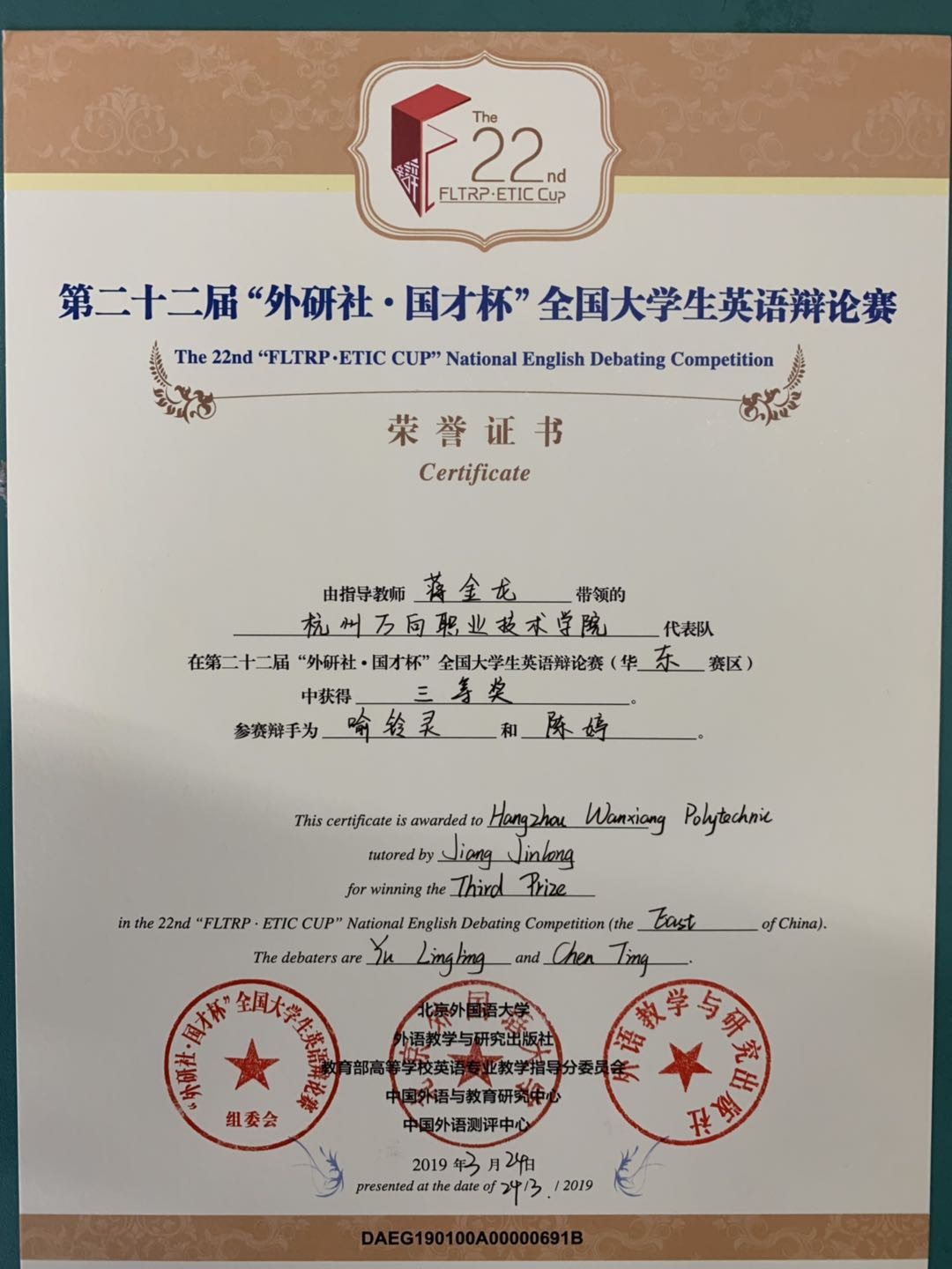 2019年3月22日至24日,第二十二届“外研社・国才杯”全国大学生英语辩论赛华东赛区总决赛在苏州西交利物浦大学举行。来自江苏、安徽、上海、浙江、山东5省市的110支高校代表团参加了本次比赛,争夺28个全国总决赛晋级名额。我院现代服务与管理系商务英语专业171班学生喻铃灵和陈婷代表学院参加比赛,最终排名第29,成为华东地区前三十名唯一一所高职高专院校。