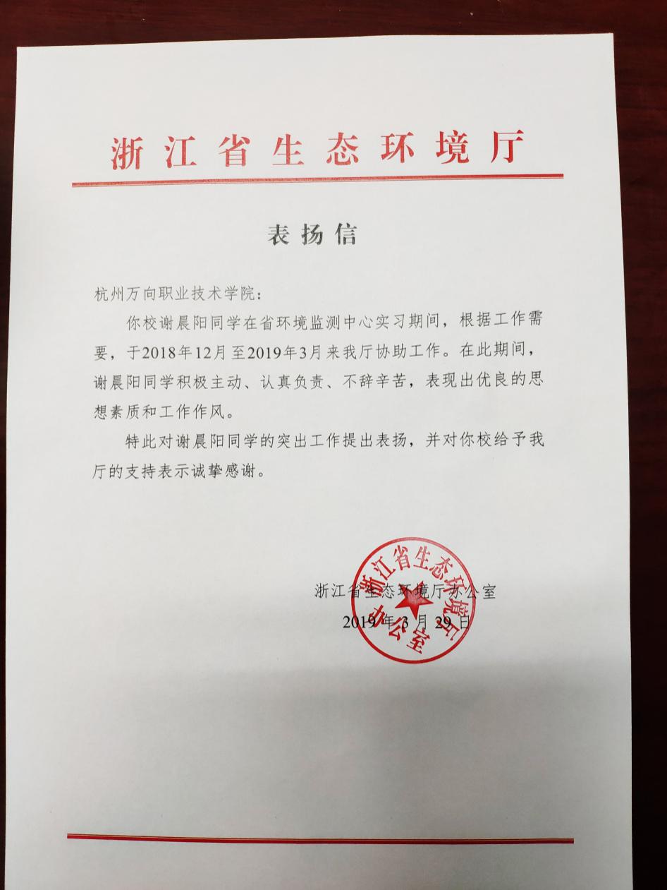 近期,我院环境监测与控制技术专业收到由浙江省生态环境厅办公室发来的表扬信,信中对我院谢晨阳同学在浙江省生态环境厅协助工作期间的突出表现进行表扬。