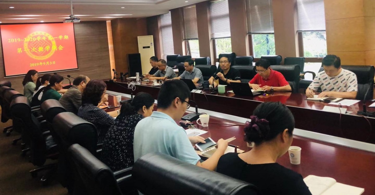 2019年9月3日下午在新校区6213会议室召开了2019~2020学年第一学期第一次教学例会。会议由教务处处长胡建华主持,教学副院长朱仁学出席会议并作了部署。各系主任、教学副主任、系办主任、教学秘书、学生发展处负责人、教师教学发展中心和教务处全体人员参加了会议。