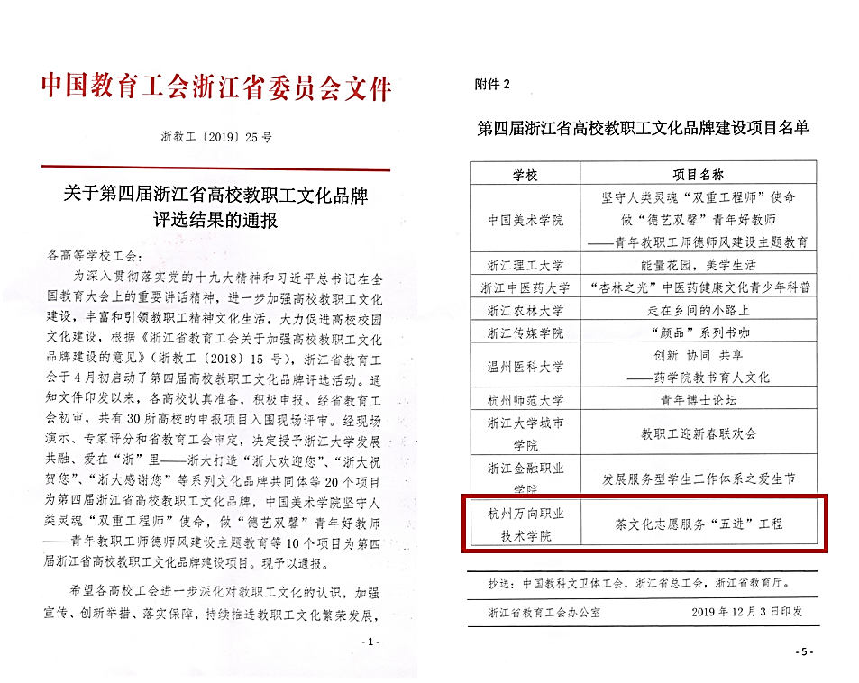 2019年4月,浙江省教育工会启动第四届浙江省高校教职工文化品牌评审活动。经初步遴选、现场汇报、专家评审等环节,我院申报的 “茶文化志愿服务五进工程”,获第四届浙江省高校教职工文化品牌建设项目。