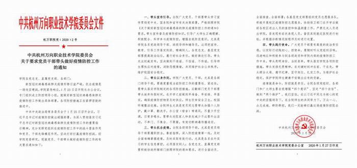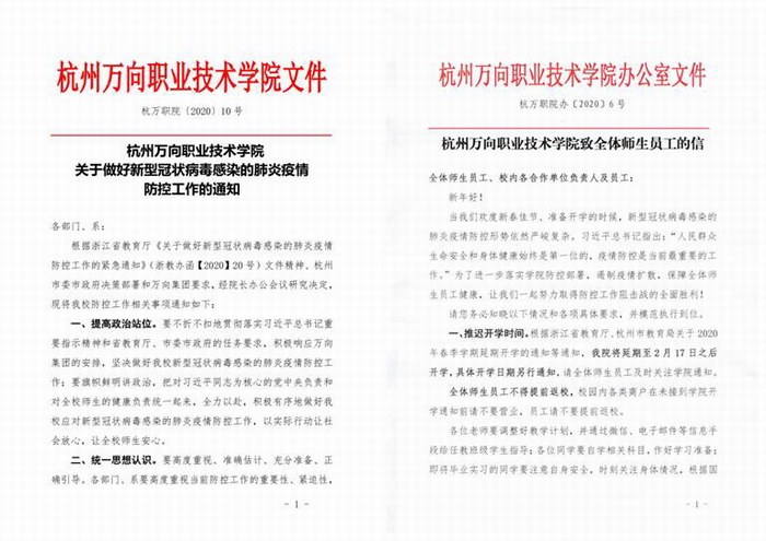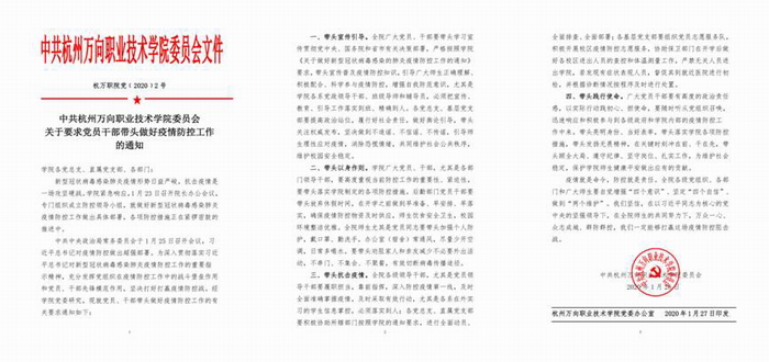 新型冠状病毒突如其来,令人猝不及防。面对来势汹汹的疫情,怎样守好责任田,护好一校人?学院认真贯彻落实习近平总书记重要讲话精神,按照省新型冠状病毒感染的肺炎疫情防控工作领导小组的统一部署,遵照省委省政府、省市教育主管部门、万向集团等相关文件的要求,层层落实疫情防控的各项工作。