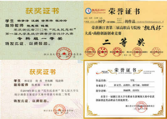 (2)积极参加校内外竞赛,开拓建设创新创业队伍。专业推行“以赛促教、课赛一体”模式,带领学生获得多项校内外竞赛获奖记录。曾获得“正大杯”全国市场调查与分析大赛一等奖2项、三等奖1项,“学创杯”创业模拟大赛浙江省赛一等奖3项、三等奖3项,浙江省第三届挑战杯创新创业竞赛二等奖、第十四届、十六届挑战杯大学生课外学术科技作品竞赛三等奖、浙江省“民生民意杯”统计调查大赛一等奖、二等奖、三等奖若干等优异成绩。