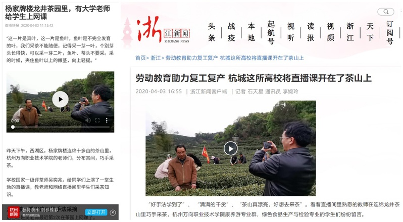 作为活动的发起者,万向学院院长牟惠康认为劳动技术教育是职业教育的初心和使命,培养劳动达人、技能达人、创造达人是学院的培养目标。在防控疫情同时支持复工复产,作为杭城高校有责任和义务贡献一份力量。“杭为茶都,当前正是春茶开采的关键时节,教职工以采茶形式,助力杭城复工复产是一个有益尝试,也为学生成为劳动达人做出了表率。这十分符合国家加强大中小学生劳动教育的要求。万向学院和茶有着深厚渊源,茶叶专业曾享誉国内外,是浙江省大学生茶艺盟主单位。学院茶文化教育渗透于教育教学活动全过程,已将茶艺列入“新六艺”课程,连同花艺、香艺、厨艺等课程,融入康养游专业群。去年康养游专业群入选为杭州高校新型专业群建设项目。