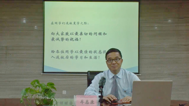 学院院长牟惠康从大学生已是成年人出发,以《说清大道理、认清硬道理、澄清歪道理》为主题,帮助同学们从明事理中激发自觉性。牟惠康院长首先向全体返校学生表达了问候和祝福。面对做好常态化防控疫情的新任务,一是说清爱党爱国的大道理,抓好“五爱”主题教育和“五不”底线管理。二是认清“健康第一、生命唯一、平安贯一”硬道理,保持身体、心理、社交健康,建设平安校园。三是澄清在疫情防控上多种似是而非的歪道理,以正确的世界观、人生观、价值观看待问题,提高判断力;以积极、阳光心态对待人生,增强自觉性。最后,他强调本次返校复学是同学们人生新的起点,期盼全体同学以最佳的状态开启新进程!