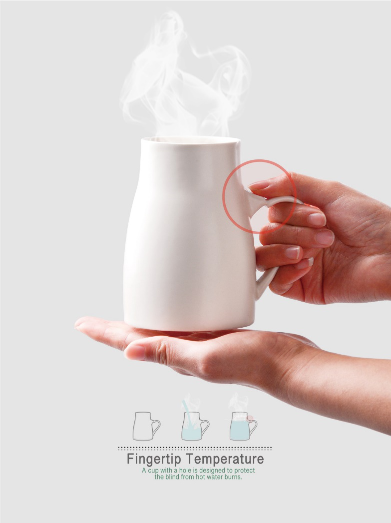 作品《Fingertip Temperature》从关爱弱势群体出发,为特殊用户发声,注重特殊群体的用户体验。该产品的把手上部特别设计了断裂语义,并在该语义上部增加了一个与壶内联通的感温凸起,手指触碰即可感受到壶内液体的温度,即使用户是无法看到的盲人,也可以通过断裂语义准确的感受液体温度。
