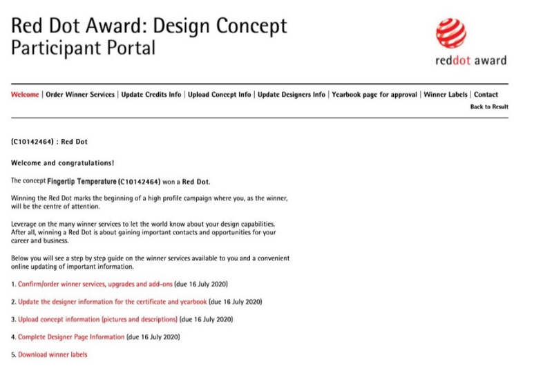 我院工业设计专业师生,经过数月努力,产生了多件高品质作品,参与了多项国际设计大奖的投稿,其中杨存园老师的作品《Fingertip Temperature》荣获2020年国际设计大奖——红点设计奖。