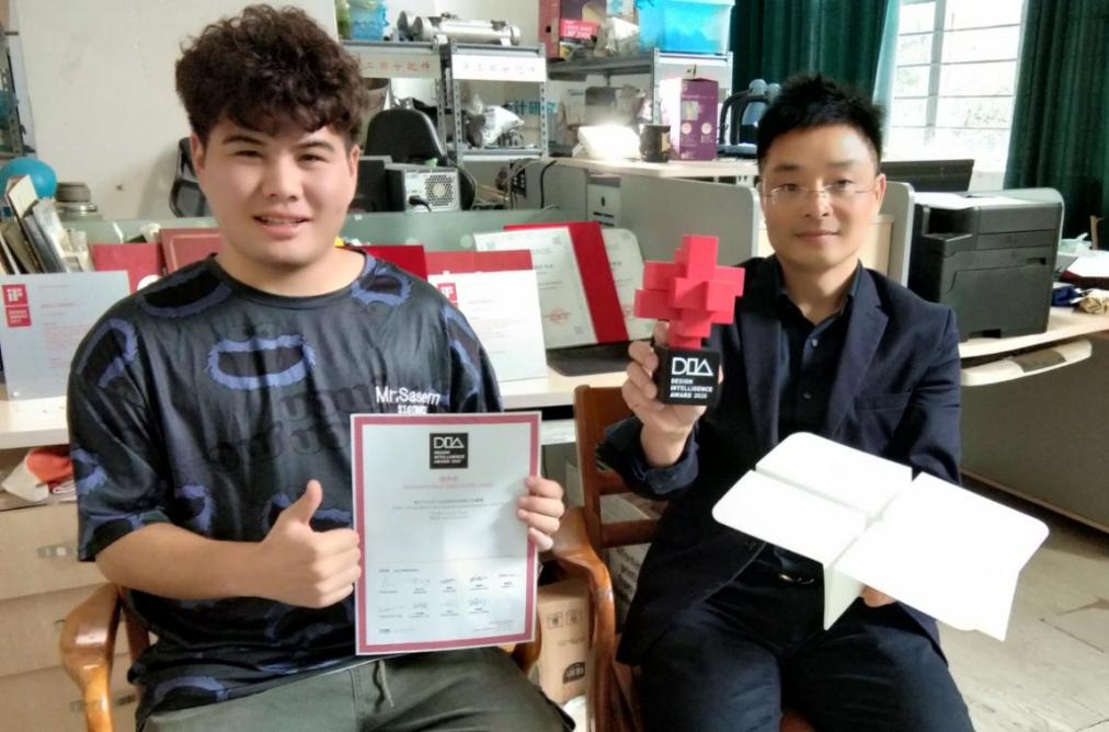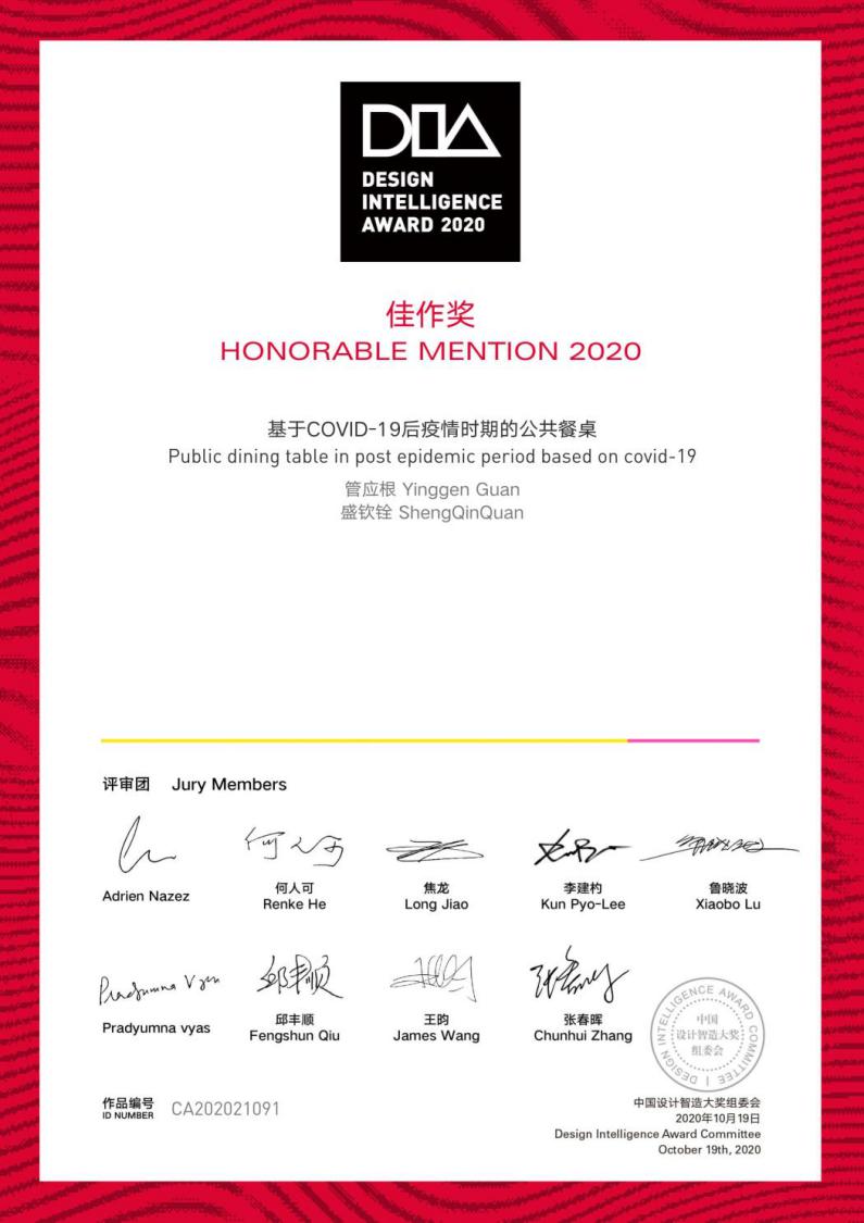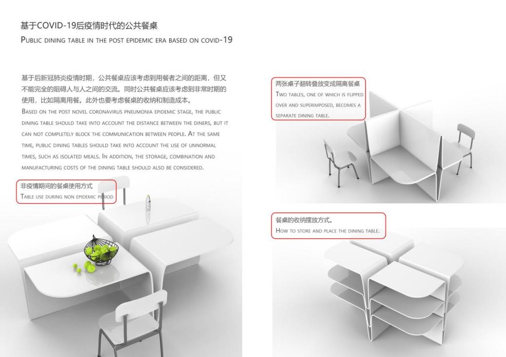 我院设计创意系工业设计专业管应根老师和2018级盛钦铨同学共同设计的“基于COVID-19后疫情时期的公共餐桌 (Public dining table in post epidemic period based on covid-19)”参加2020中国设计智造大奖,在7369件参赛作品中脱颖而出,顺利成为325件决赛作品之一并最终获得佳作奖。