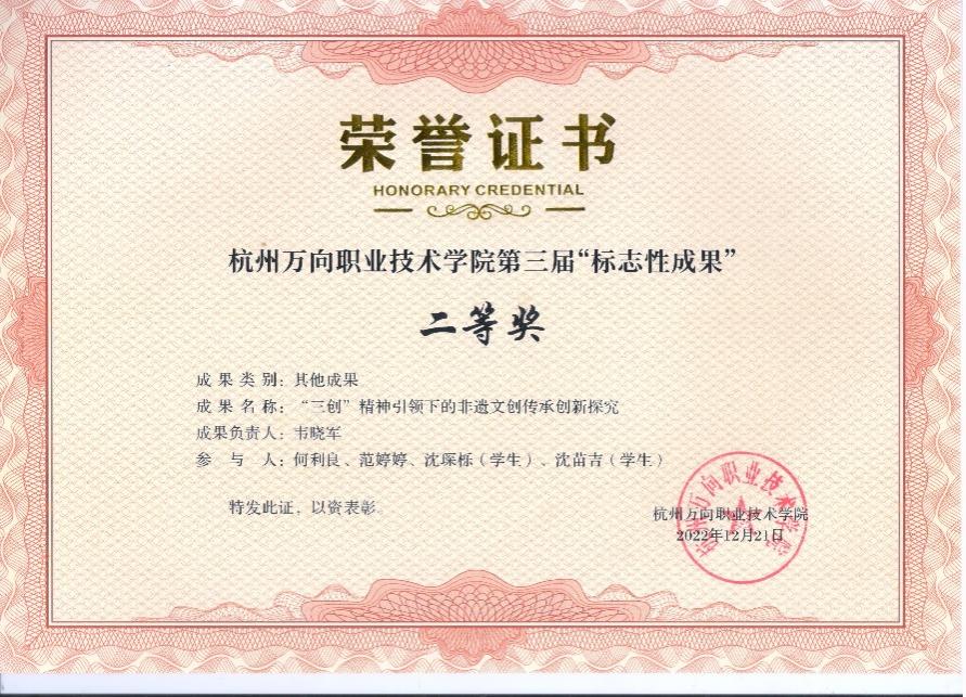 In the past five years, the teachers of teaching and research section have completed nearly 20 provincial teaching reform projects, published nearly 30 papers, edited 3 textbooks, and guided students to participate in the Chinese classics reading competition of Zhejiang Province University Students for many times, and won the first prize and second prize; 'Live inheritance, integration and innovation - creating the educational achievements of traditional Chinese culture' won the second prize of the landmark achievement of Hangzhou Wanxiang Polytechnic in 2021. "Exploration of Non-heritage Cultural and Creative Heritage Inheritance and Innovation under the Spirit of 'Three Creations'" won the second prize of the college's signature achievement in 2022.