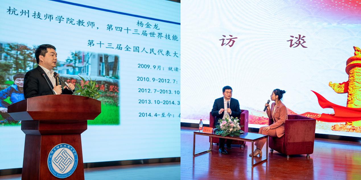 本次报告会主讲嘉宾是第43届世界技能大赛汽车喷漆项目冠军、全国技术能手、浙江省五一劳动奖章获得者,也是一名“90后”全国人大代表杨金龙,他为万向学子们带来一场题为“弘扬劳模工匠精神·实现青春奋斗理想 ”的专题分享。