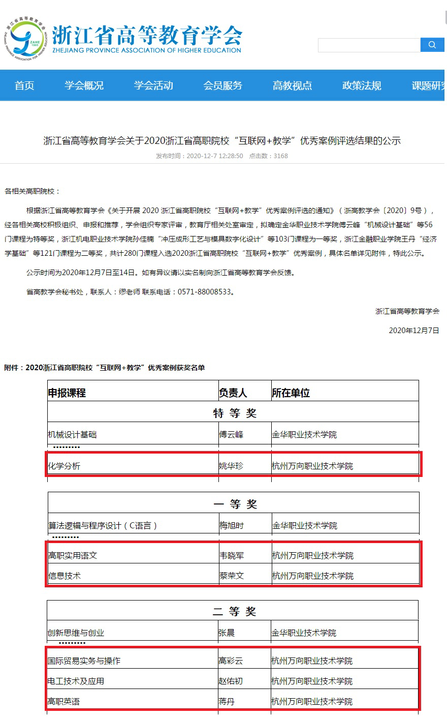 ——2020年浙江省“互联网+教学”案例评比中,姚华珍老师的《化学分析》获得特等奖,韦晓军老师的《高职实用语文语》、蔡荣文老师的《信息技术》获得一等奖,高彩云老师的《国际贸易与实务操作》、赵佑初老师的《电工技术与应用》和蒋丹老师的《高职英语》获二等奖。