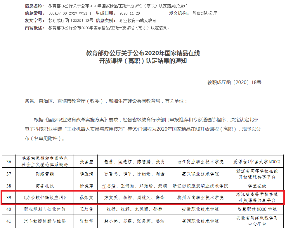 ——蔡荣文老师主持的《办公软件高级应用》被教育部认定为2020年国家级精品在线开放课程,实现了学院国家级精品在线开放课程“零”的突破。