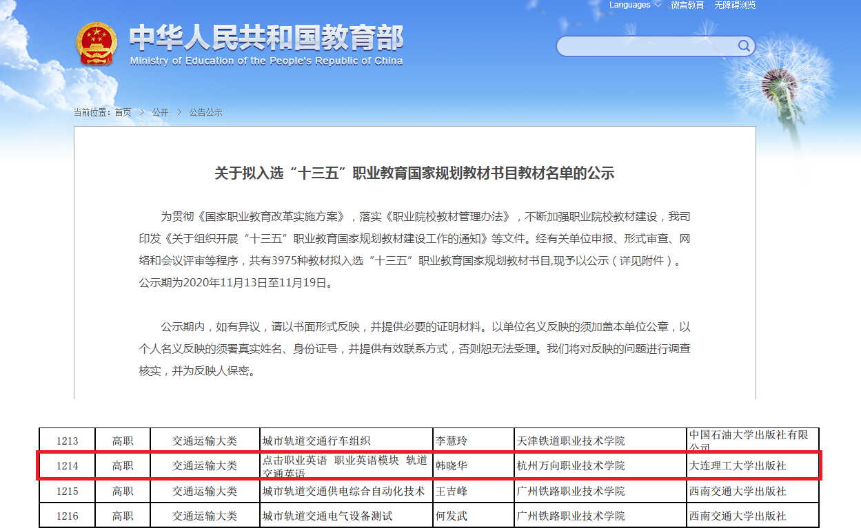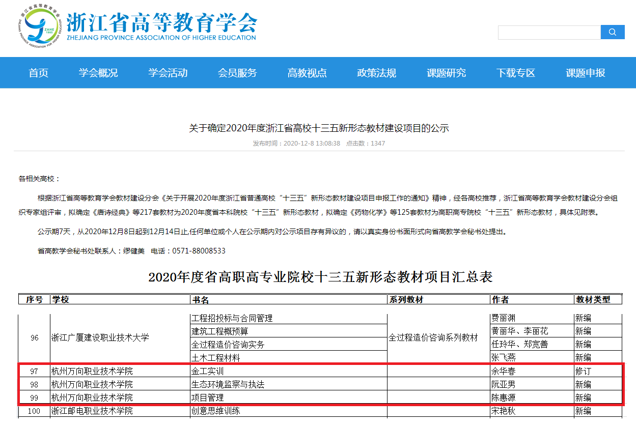 ——2020年度浙江省普通高校“十三五”新形态教材建设项目评审中,余华春老师主编的《金工实训》、阮亚男老师主编的《生态环境监察与执法》和陈惠源老师主编的《项目管理》获立项建设,韩晓华老师主编的《点击职业英语:职业英语模块——轨道交通英语》获“十三五”职业教育规划教材立项建设。