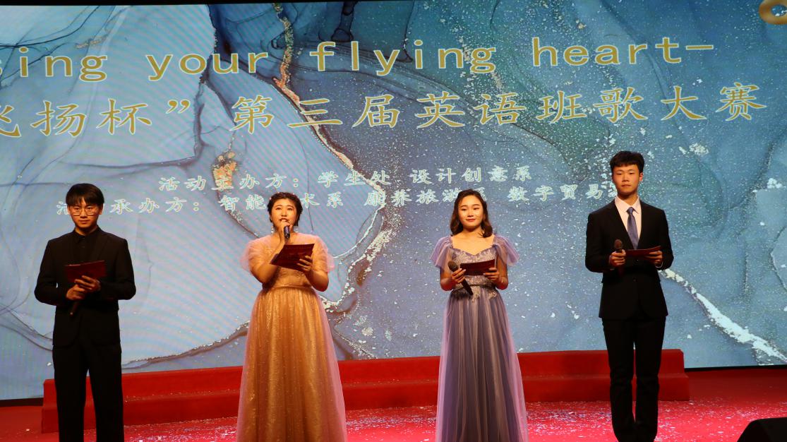 为营造英语学习氛围,丰富校园文化生活,激发学生对英语学习的兴趣,给学生提供一个锻炼自我、展示风采的舞台。由学生处、设计创意系主办,智能技术系、康养旅游系、数字贸易系协办的第三届“飞扬杯”英语班歌大赛于12月22日在2号校区小报告厅举行。学院副院长高兰、学生处副处长严鹏、设计创意系总支书记/副主任范婷婷、学院团委书记方烨枫、各系负责英语提升辅导员担任了本次大赛的评委。