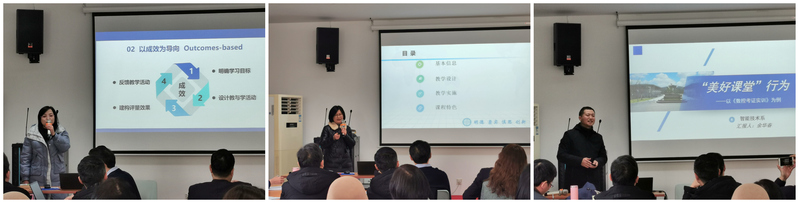 黄格红、姚华珍、余华春三位老师分别为大家做了主题为“组织教学”教师的第一行为、“线上线下混合式教学”实施和“美好课堂”行为的经验分享。他们围绕“课堂革命”这一主题,从课堂组织、教学设计、教学实施、效果评价、改革收获、学生成果展示、个人体会等方面细致生动地讲解了自己的做法和切身体会。