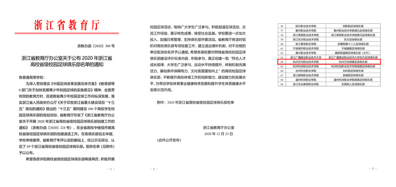 2020年12月,浙江省教育厅办公室公布2020年浙江省高校省级校园足球俱乐部名单,我院“明德”足球俱乐部,被评为:浙江省高校“省级校园足球俱乐部”,这是我院体育首次评定的省级项目。