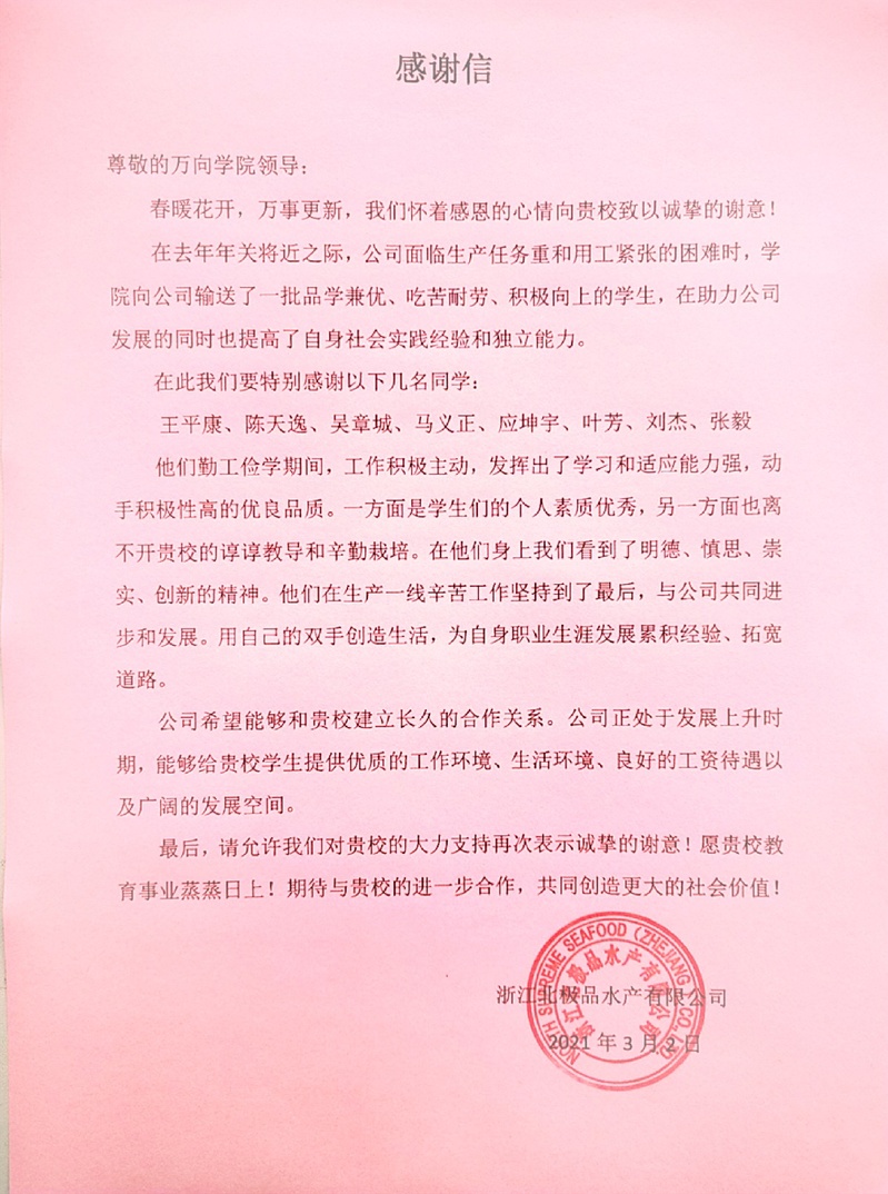 “他们在勤工俭学期间,工作积极主动,发挥出学习和适应能力强,动手积极性高的优良品质。”近日学院收到一份来自杭州北极品水产有限公司的感谢信,信中高度赞扬我院学子参与勤工俭学,助力企业生产的事迹。