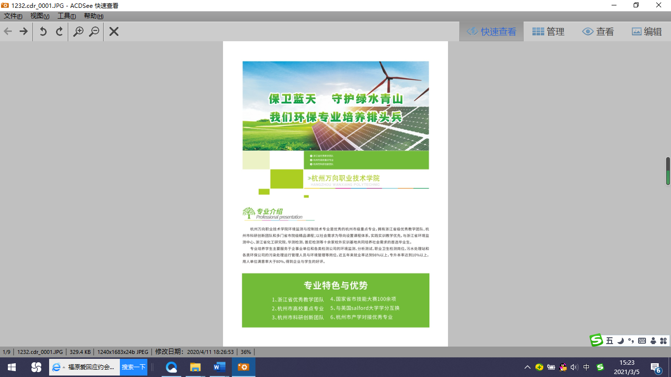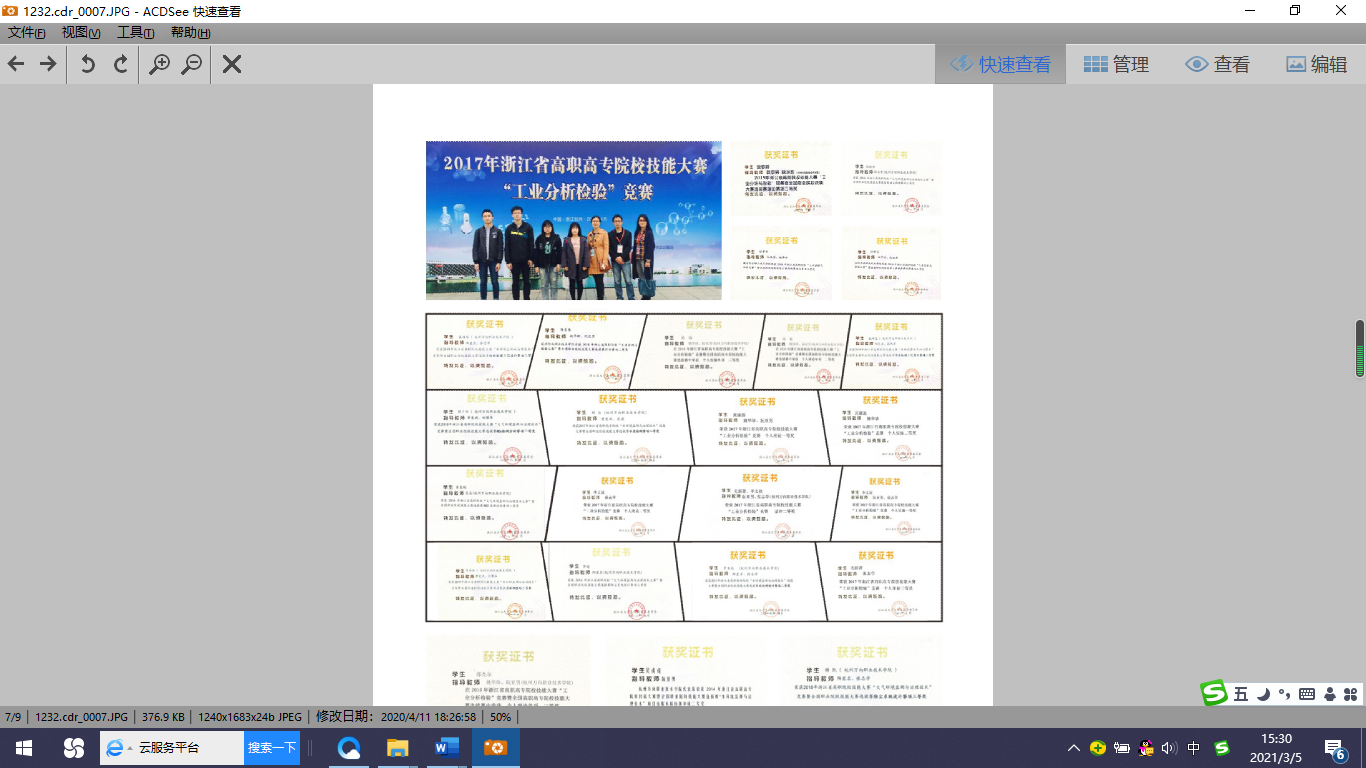 专业注重师生技能提升,多年来荣誉国家省市技能大赛100余项荣誉,先后获得国家环境监测技能大赛团队仪器分析一等奖、化学分析实操一等奖、化学分析理论一等奖等多项优秀成绩;获得由浙江省教育厅举办技能大赛选拔赛的水质监测一等奖、污水处理工艺设计二等奖、水处理设计和大气处理设计二等奖、水处理安装调试三等奖等多项荣誉。以赛促学,以学竞赛,学让我们的学生发挥其所长,在专业技能领域展现自已的风采。