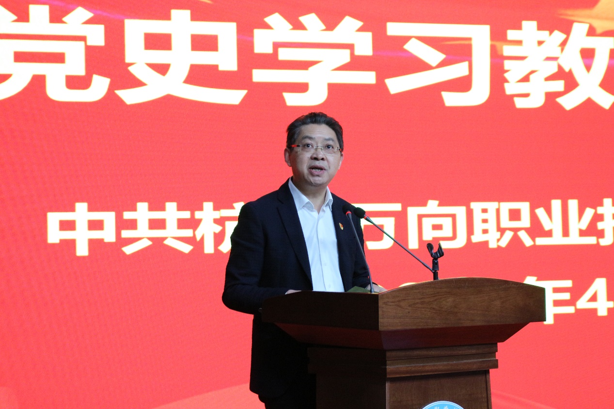 党委副书记、副院长朱仁学就党史学习教育工作提出三点要求。一是要统一思想,深化认识,增强政治自觉。切实把思想和行动统一到中央及省委、市委和集团党委部署要求上。二是要联系实际,学以致用,增强党建引领。把学习成果转化为推进双高建设、提高教学质量、推进全人发展教育的强大动力。三是要加强领导,严密组织,增强学习实效。各党总支、党支部要引导广大党员干部把党的历史学习好、总结好、传承好、发扬好,并组织全体职工参与到党史学习教育活动之中,学到精髓,学出实效。