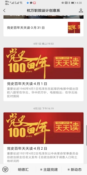 2月初,设计创意系党总支通过微信公众号开设“百封红色家书师生诵读”、“党史百年天天读”专栏,拉开庆祝建党100周年系列活动的序幕,至今已推送“百封红色家书师生诵读”9期,“党史百年天天读”40余期。