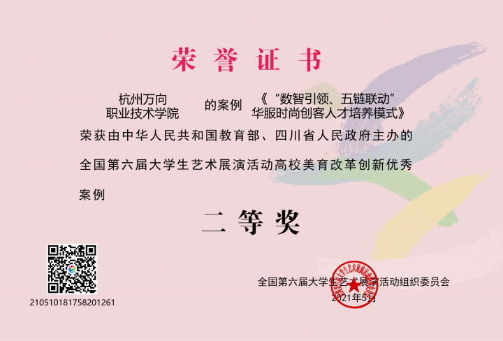 5月12日晚,由中华人民共和国教育部、四川省人民政府共同主办的全国第六届大学生艺术展演活动在成都闭幕。学院选送的《“数智引领、五链联动”华服时尚创客人才培养模式 》(作者:黄格红老师)荣获高校美育改革创新优秀案例“二等奖”。