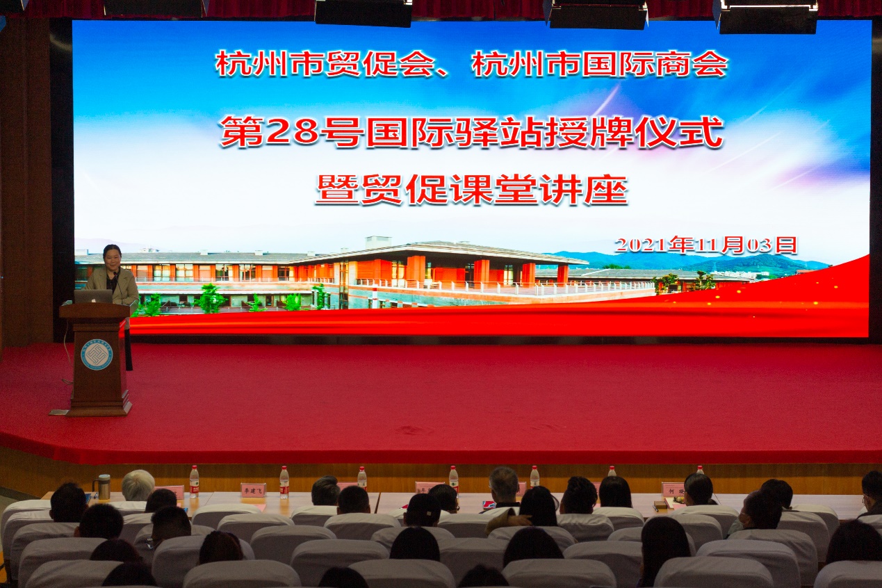 11月3日下午,杭州市国际商会第28号国际驿站授牌仪式暨贸促课堂讲座在我院隆重举行。杭州市贸促会、国际商会会长郑荣新,杭州市贸促会二级巡视员、国际商会副会长沈小艇,学院院长牟惠康教授、副院长高兰教授,以及企业代表、数字贸易系师生共200余人出席了本次活动。授牌仪式结束后,特邀请贸促课堂专家李建飞老师作题为“阿里巴巴新商业模式创新”的讲座,得到广大师生欢迎。