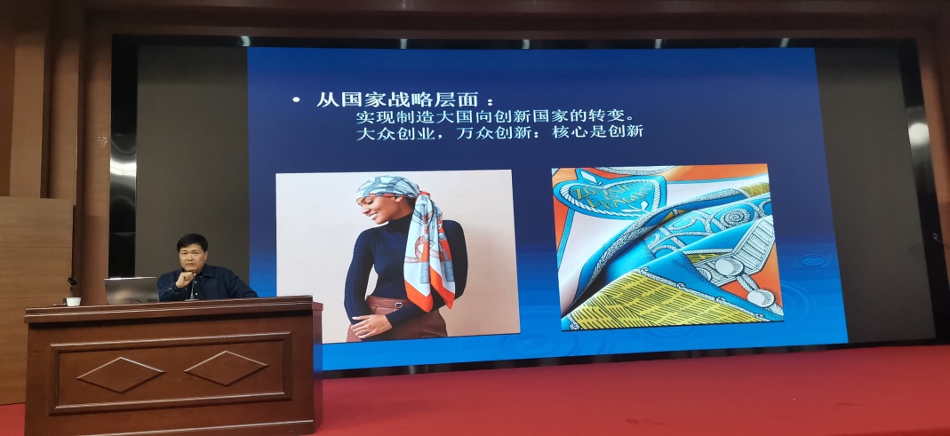 叶文教授则从国家战略层面出发,阐述创新驱动的重要性以及途径。叶教授说道,当今中国实体经济正遭遇前所未有的挑战,成本、资源、出口外资内需的困局按照以往传统解决方案无法解决,拼价格、拼付款只会造成劣币驱逐良币。基于时代背景,创新设计迫在眉睫。叶教授结合纺织机械工厂的实践经验,阐述创新设计的途径有新技术、新工艺、新材料和新创意。同时他告诉同学们成为一名合格的设计师必须要多学、多做,广泛涉猎、不断积累,方可厚积薄发,在生活中,要有时代精神,苦难可能是对自己最好的磨练,教授同样强调了复合性人才培养以及提高个人品味和修养的重要性,殷切希望我校学生吃的了苦、下的了苦功夫,严谨、认真、精益求精。