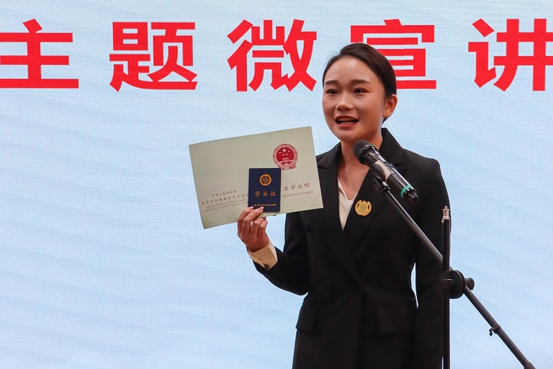 会上,学院领导为宣讲团指导教师和首批16名宣讲员颁发聘书并佩戴徽章;院团委副书记陈宝旗宣读学院成立“00 宣讲团”的通知。随后,宣讲员余耀芹、蔡馨依、方震康等为全体在场师生进行了第一次主题微宣讲。他们从党的十九届六中全会精神、习近平法治思想等方面讲述了自己的学习体会和亲身经历,精彩、生动、接地气的宣讲,赢得了在场所有人员的阵阵掌声。