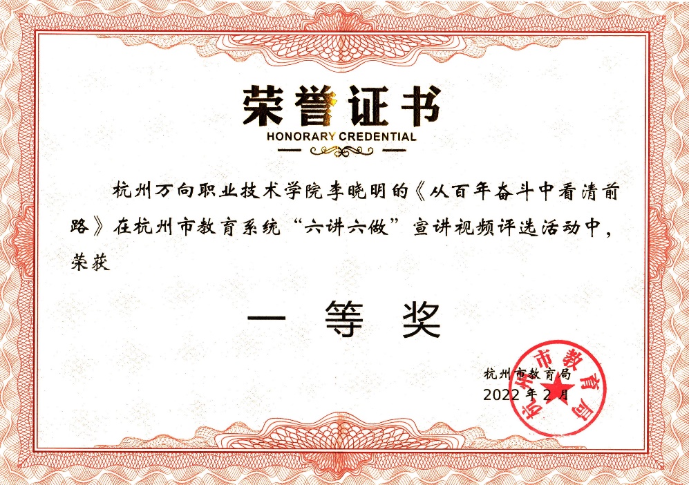 近日,在杭州市教育局举办的市属教育系统“六讲六做”优秀宣讲视频评选中,我院党委宣传部选送的作品喜获一等奖,该作品由设计创意系(思政部)李晓明副教授主讲《从百年奋斗中看清前路》。