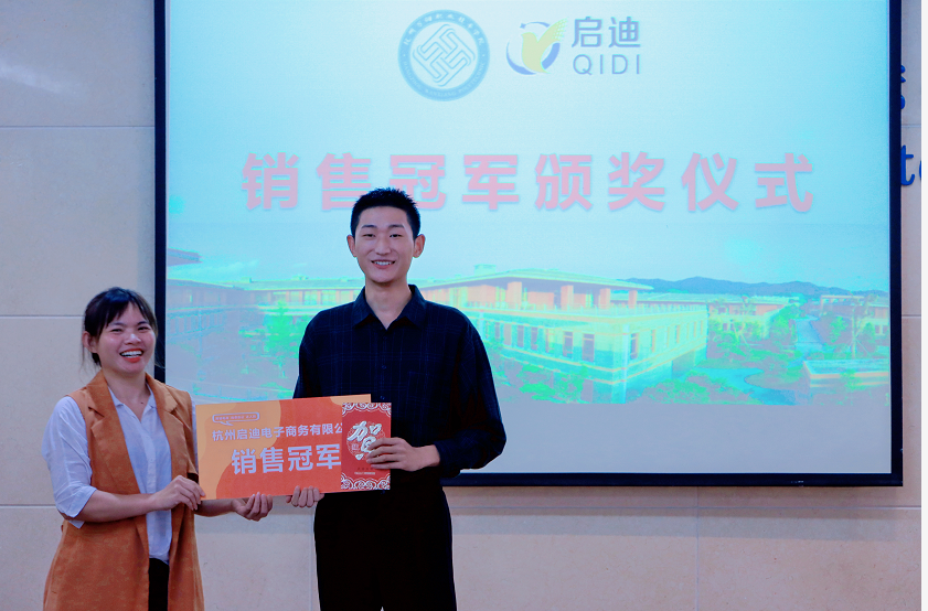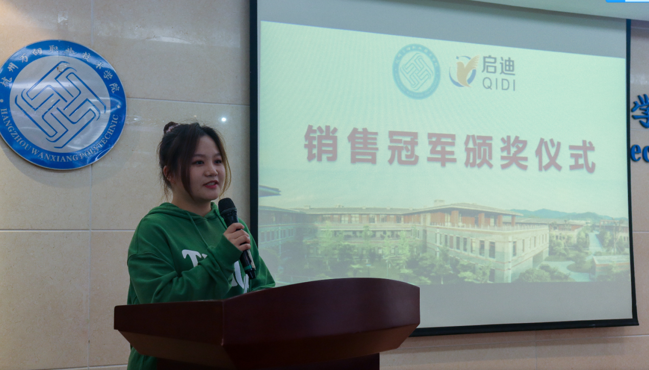 动仪式上还举行了销售冠军颁奖仪式,由四家企业负责人分别为团队销售冠军颁发奖牌和奖金。“岗课赛证”达人班成立以来,全体同学共拿下了来自美国、俄罗斯等35个国家208个订单,出单金额3688美金。这些真实订单的获得证明达人班的同学已经具备了较强的业务操作能力,是达人班高技能高素质人才培养效果的有力证明。在所有同学中,有四位同学出单金额名列前茅,成为了各合作企业团队的销售冠军。随着获奖同学登台领取奖牌和奖金,现场欢腾一片,将此次启动仪式推向高潮。“非常感谢学校给我在达人班学习的机会,通过公司专家和校内老师的悉心指导,让我熟练掌握了产品上传等技能,很荣幸获得今天的销冠奖,在今后的日子里,我会努力学习更多专业知识和技能,让自己更快地进步与成长。”在随后销售冠军代表的发言中徐梦瑾如是说。
