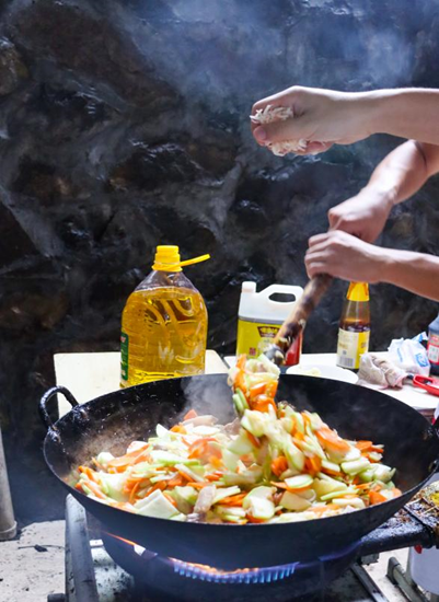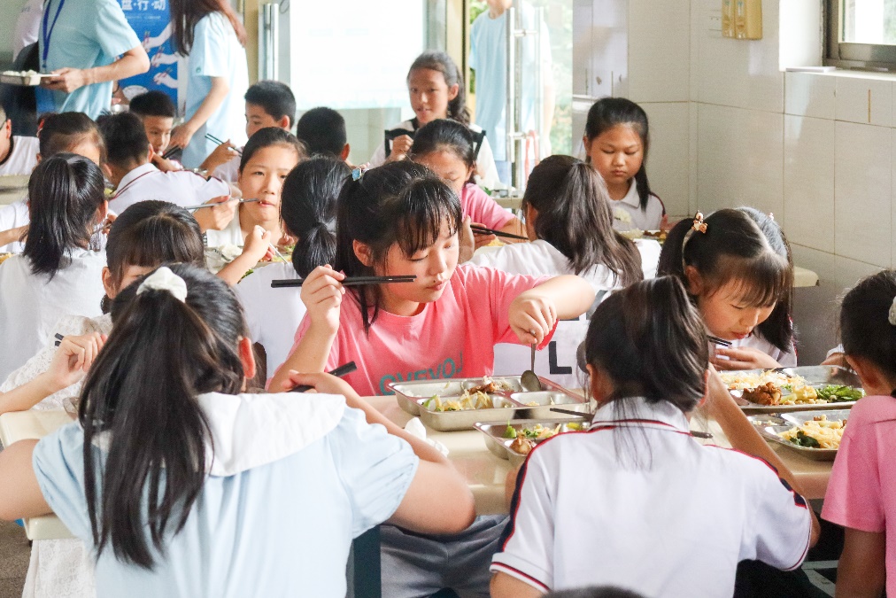 另一小分队出发去菜场购买食材。面对无从下手的大锅饭,同学们互相配合,发挥各自优势,五凤第一餐出锅了——肉饼蒸蛋、手撕包心菜、番茄炒蛋、西葫芦炒虾皮、紫菜蛋花汤,看到孩子们把饭菜吃得精光,并纷纷点赞说好吃,初次合作下厨的同学们瞬间一扫疲惫。