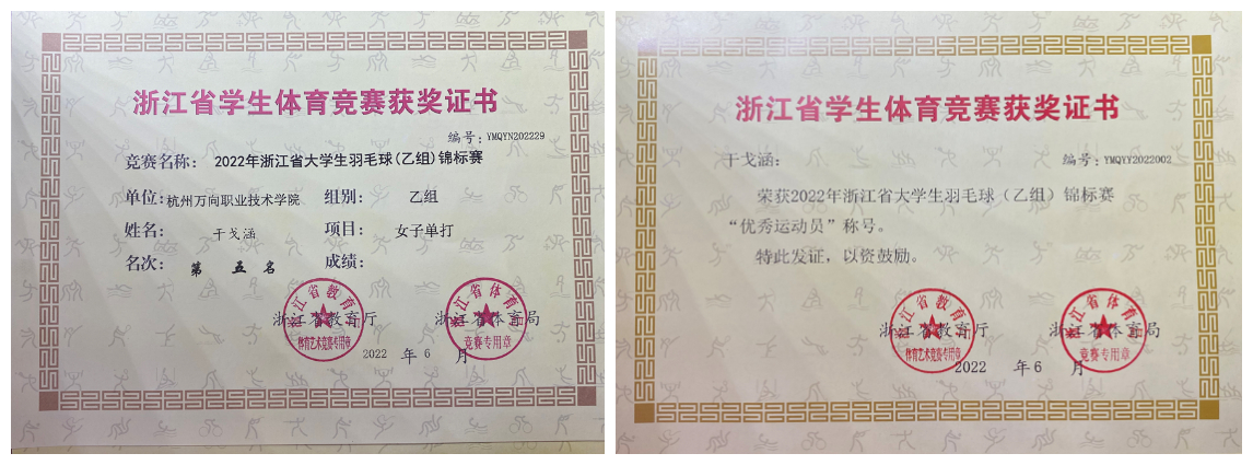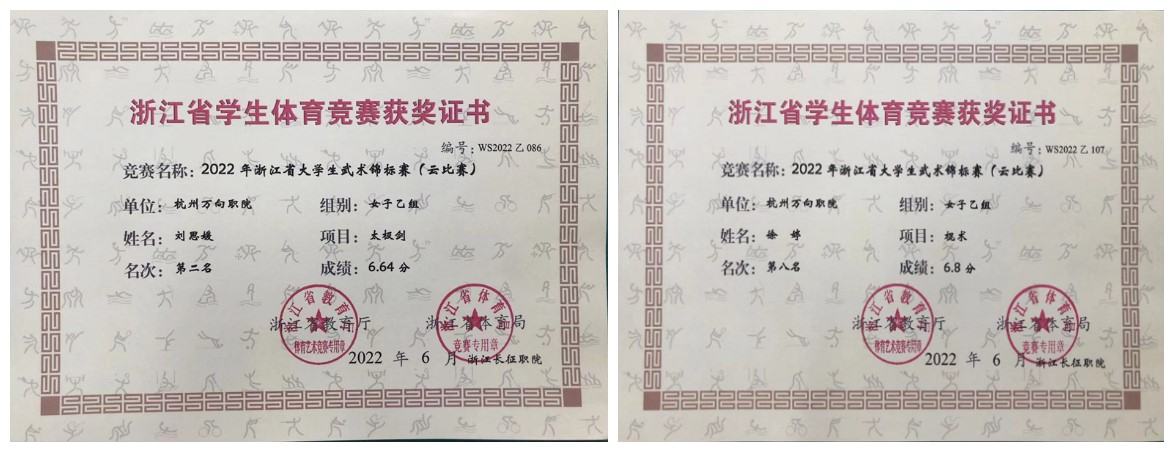 近期,我院体育健儿在2022年浙江省大学生武术锦标赛、2022年浙江省大学生羽毛球锦标赛、浙江省第七届大学生田径锦标赛等多项省级比赛中取得优异成绩,为学院争得了荣誉。
