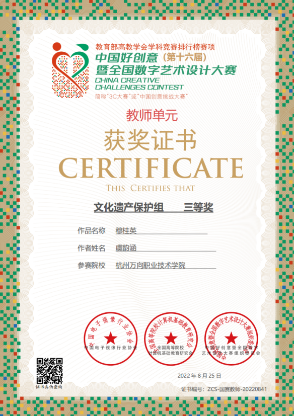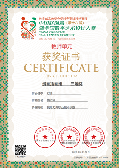 服设专业教师获得“第十六届中国好创意暨全国数字艺术设计大赛”荣誉证书