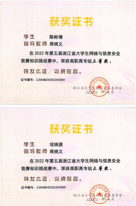 9月24日,第五届浙江省大学生网络与信息安全竞赛决赛在各参赛高校成功举行。我院大数据技术专业周桃义老师指导的大数据技术211班陈彬倩同学和城轨203班项锵源同学双双获得三等奖。