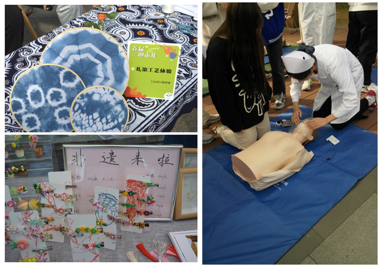 在天幕撑开、帐篷立起、彩旗飘扬、气球妆点、音乐响起的同时,茶具展示、汉服体验、电商直播、食品烘培、急救演示、雕版印刷、“盘纸”非遗技艺……一个个原本在教室和实训室中的教学场景纷纷化成了市集体验和展示共享,师生们以别具一格的方式,感受了一番创造、创业、创新“三创教育”带给师生们的教学魅力与行动张力。