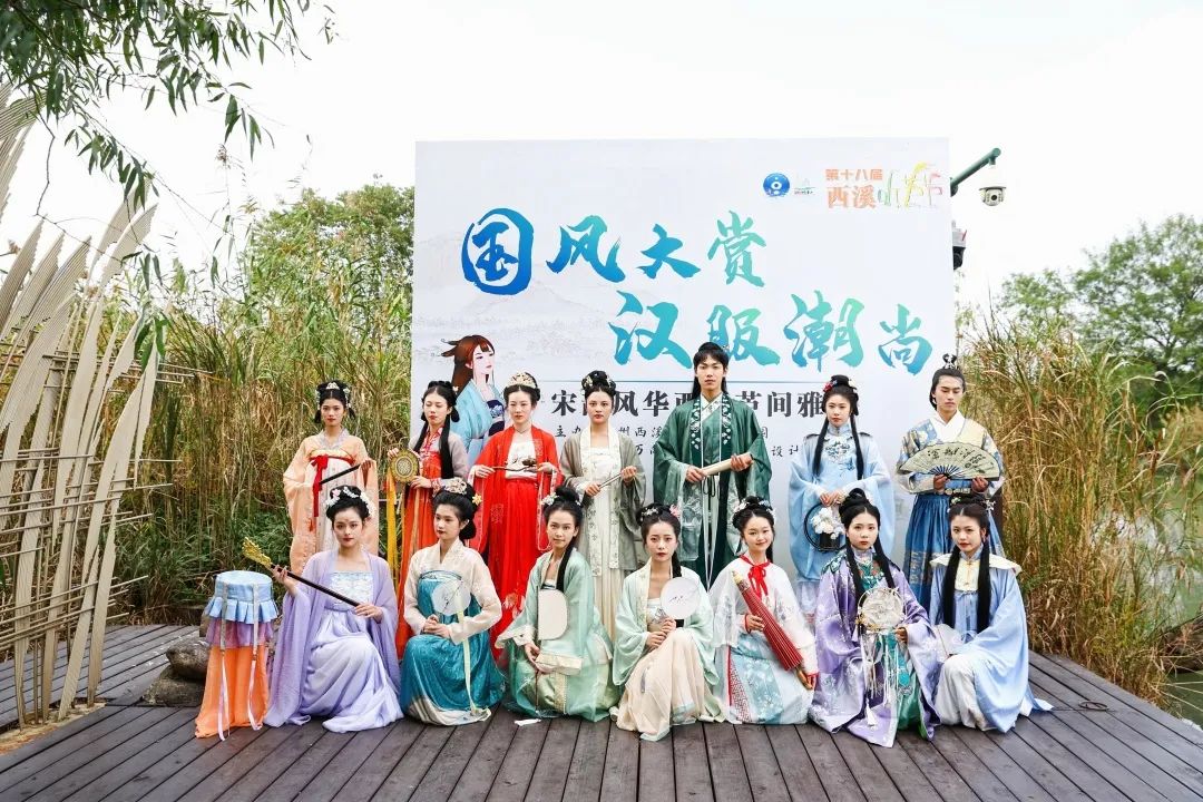 “今天展示演绎的汉服都是我们学院学生自主设计制作的。”指导教师黄格红说,这些作品以宋制服饰为核心,涵盖了隋、唐、明等时期原创汉服元素。这次来为西溪听芦节锦上添花,旨在全面系统地将传统文化与现代时尚相结合,助力宋韵文化传承,共富彰显杭州时尚。