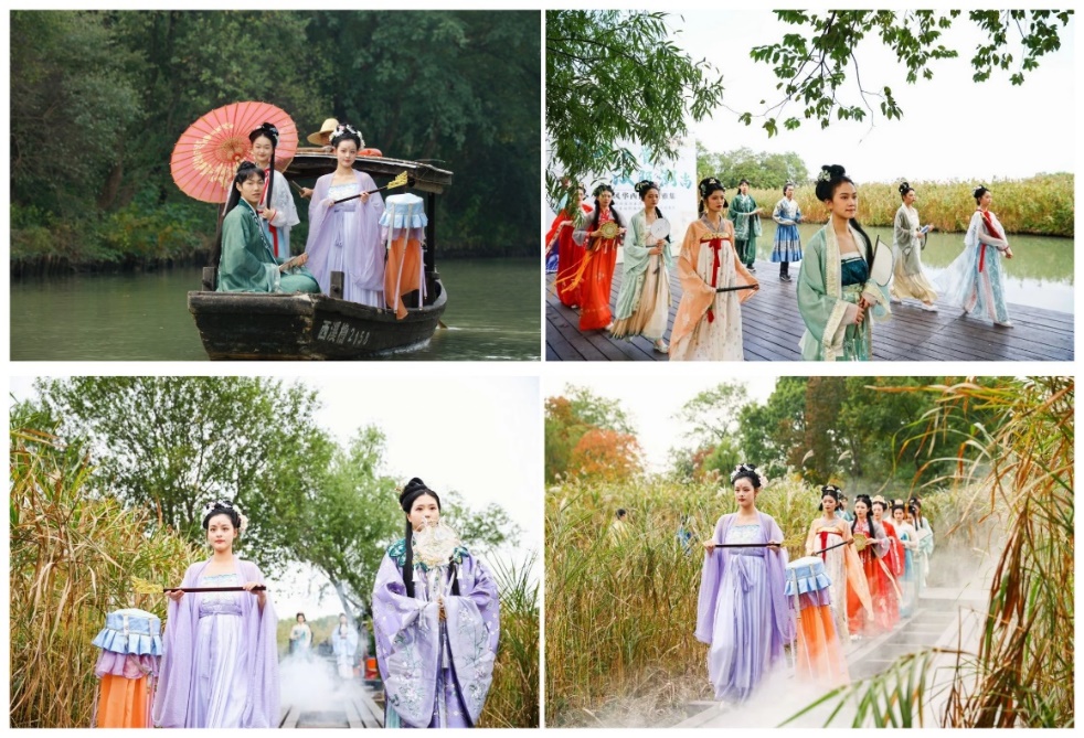 当天在秋雪庵,一群身着精美汉服的翩翩少年,时而在芦白柿红中闲庭信步,谈天说地,时而在摇橹船上低吟浅唱,巧笑倩兮。男孩俊朗儒雅勃勃英姿,女孩秀丽温婉楚楚动人,在华美大气、色彩斑斓的传统服饰衬托下,模特们仿佛穿越千年,与鸟叫虫鸣的湿地秋日盛景融为一体,诠释了我国古代的生活美学,用国风潮尚助力宋韵文化传承和活化,为西溪营造了唯美古风氛围与深厚的人文意境。参加开幕式的佳宾游客,大赞看到了“天上仙子”“书画中人”,身临其境地感受了宋韵风雅。