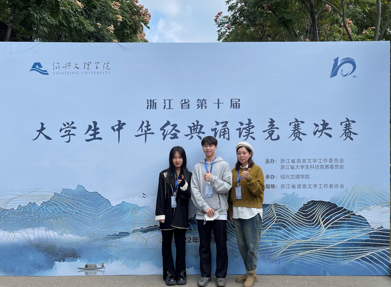 近日,浙江省第十届大学生中华经典诵读竞赛决赛在绍兴文理学院举行。我院参赛选手在人文与艺术教研室张瑞、韦晓军老师的精心指导下,在比赛中表现出色:彭宇杰同学(2021级国际经济与贸易专业)荣获高职高专个人组一等奖、张瑶(2021级服装设计与工艺专业)荣获高职高专个人组二等奖,吴庭庭(2021级跨境电子商务专业)、庄金琦(2021级绿色食品生产与检验专业)荣获高职高专个人组三等奖,张瑞、韦晓军老师获优秀指导教师奖。