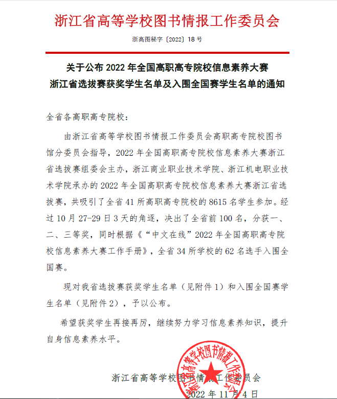 全国高职高专院校信息素养大赛是推动全国高职高专院校开展素养教育教学,展示先进教学成果,提升师生数字素养技能,交流信息化教学经验,促进全国高职高专院校信息素养教育全面健康发展的赛事,由浙江省高校图书情报工作委员会主办。