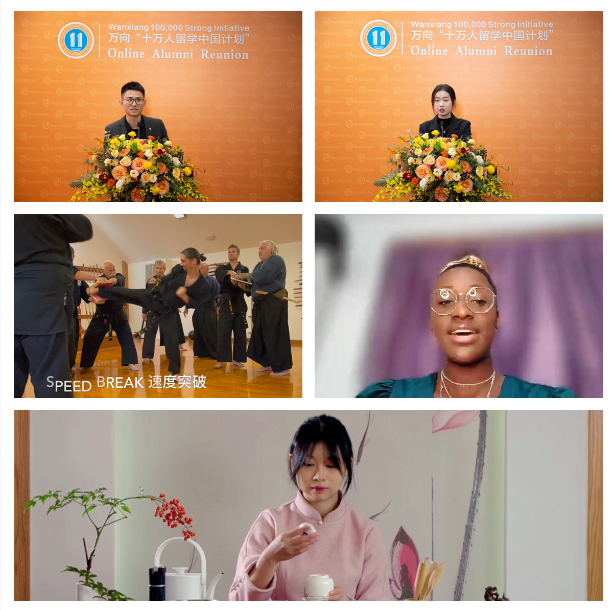 大家回忆参与“十万强”项目的难忘经历,分享各自近况,表达思念之情。美国校友Trevor Roe特别开心地讲述了今年与万向学院的师生组队备战“中美青年创客大赛”,一举获得中国总决赛两项大奖,并获得美国驻华领馆认证的经历。两国学生还各自拿出了精心准备的节目,中国学生大使展示了雅致的茶艺、美国校友带来精彩的武术表演,更有两届“汉语桥”冠军获得者校友Teshurah Lee的中文歌曲《传奇》,令大家惊叹,掌声不绝,将活动推向高潮。一曲唯美的《茉莉花》为聚会划上句号,寓意中美两国青年学生的友谊,以万向“十万强”为桥梁,如茉莉花的花语一般,永葆纯真、质朴、绵长。