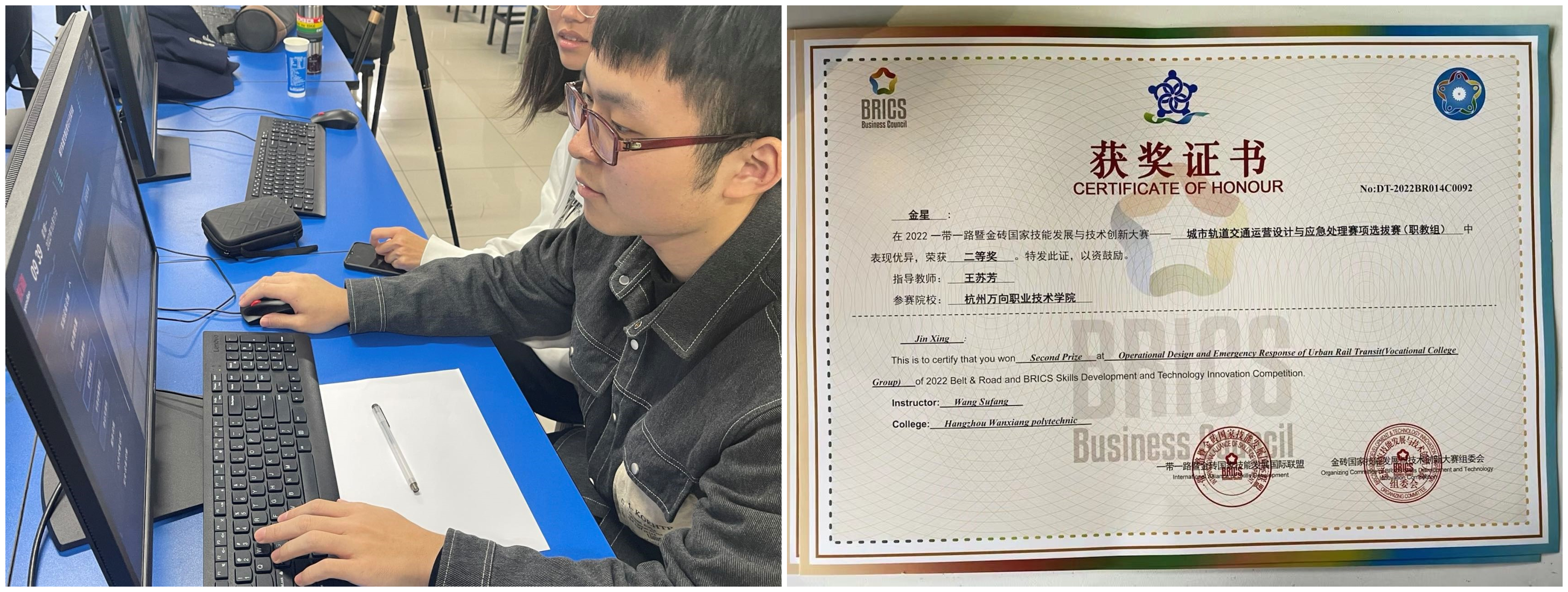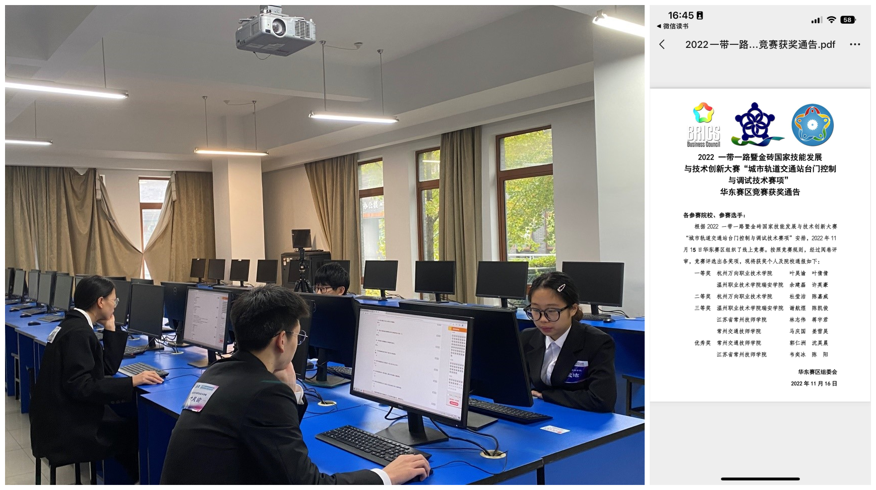 10月至11月,2022一带一路暨金砖国家技能发展与技术创新大赛多个赛项陆续开赛,我院城市轨道交通运营管理专业由赵帅帅老师带队,杨文远、刘莹莹、王苏芳、季云健、吴家佳老师分别指导,先后派出6支队伍参加了三个赛项的比赛。经过激烈的角逐,三场赛项累计收获一等奖1项、二等奖2项、三等奖2项、优秀奖1项。金星同学获城市轨道交通运营设计与应急处理浙江赛区二等奖入围全国总决赛;叶昊谕、叶倩倩同学获城市轨道交通站台门控制与调试技术华东赛区一等奖进军全国总决赛,陈嘉威、杜莹洁同学获二等奖;陈嘉威、杜莹洁、肖婧轩同学获城市轨道交通运营管理技术浙江赛区A模块“行车值班员”赛项三等奖,叶昊谕、叶倩倩、卢明月获B模块“站务员”赛项三等奖,竹安琪、李俊鸿、裘锦昊获B模块“站务员”赛项优秀奖。